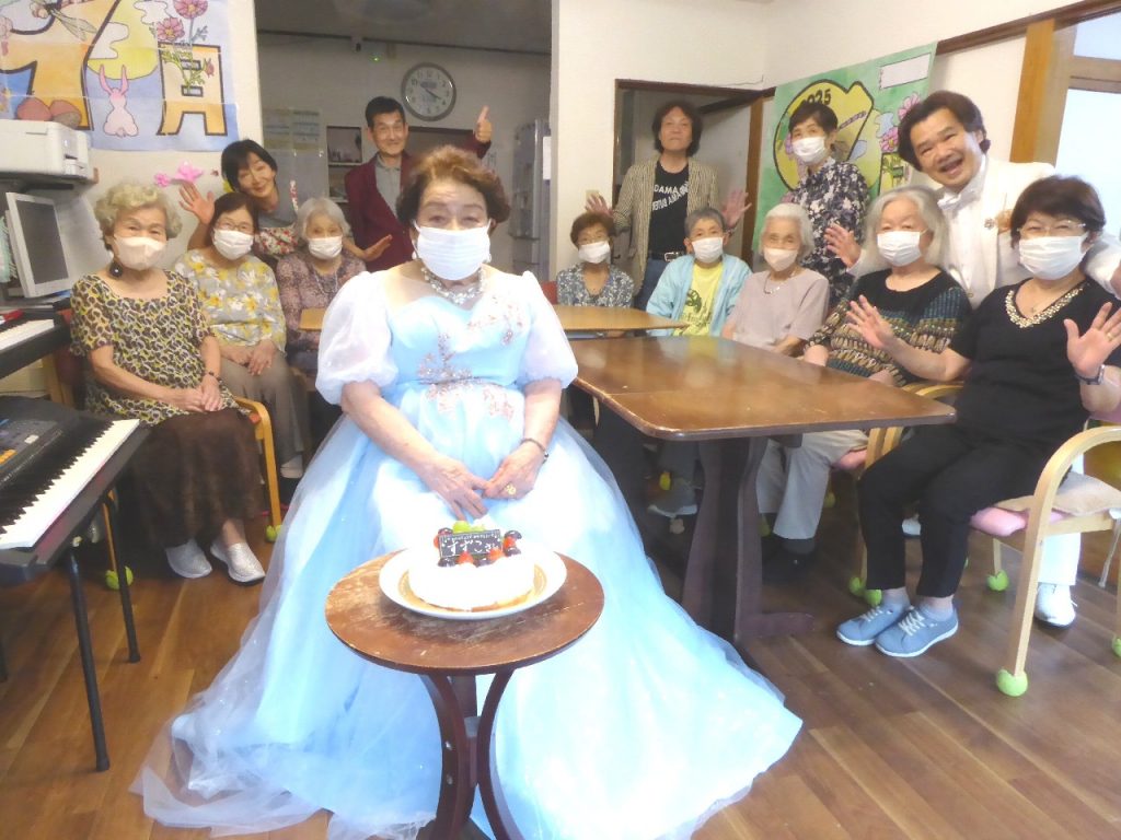 そんなH様には水色のふんわりドレスを着ていただきました。ドレスアップの着付けには西デザイナー?の助手としてネギ君がデビューしたとのこと! 上手くいきましたね。もちろんのこと大拍手&大盛り上がり! この日は歌い手が3人いましたので、お祝いの歌はちょっとしたミニコンサートになりました。