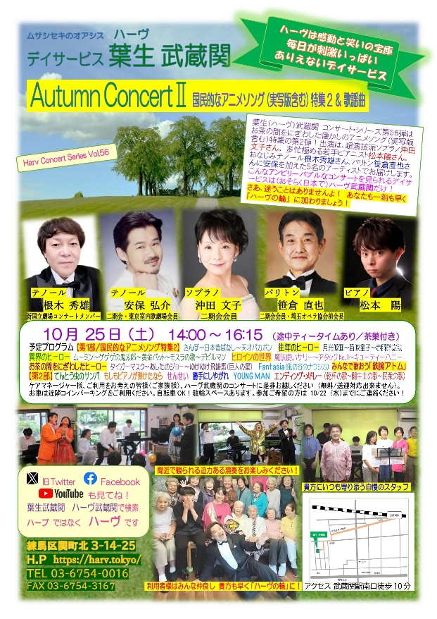 デイサービス 葉生(ハーヴ)武蔵関では、10/25(土)14時~ コンサート・シリーズ第56弾 Autumn Concert Ⅱ (国民的なアニメソング(実写版含む)特集2&歌謡曲)を開催します。