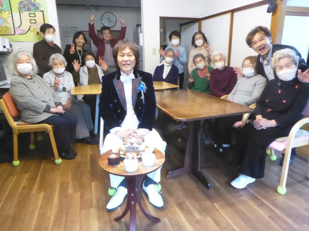 さて、今回はブルーの衣装に身を包み満面の笑みを湛えながら登場。思わず「ワアッ~」と大歓声があがりましたよ! そして大拍手。ハッピーバースデー大合唱の後は、直さんと私がネギちゃんへ歌のプレゼント!? 気恥ずかしさからか、二人とも歌詞がおぼつかない有様にて苦笑するしかありませんでしたね~。ネギちゃんからも利用者様へ感謝の気持ちを込めて歌のプレゼント。最後はいつものように3人の歌で締めくくりました。写真もいっぱい撮りましたね。利用者様もとっても良い表情で写っていましたよ。良かったです。おめでとう、ネギちゃん。最近の活躍ぶりは目を見張るものがあるよ! 料理の腕前もめきめき上がっているし、まさに大ブラヴォーだね! これからも一緒に更なる高みを目指していこう!