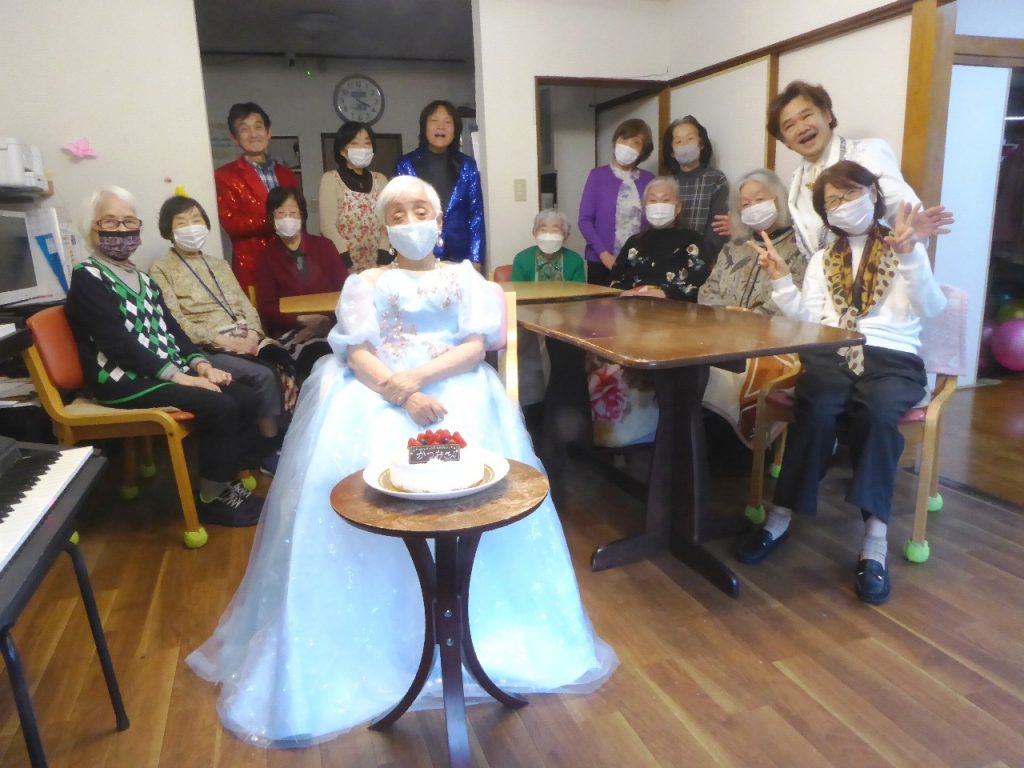 ハーヴ入られてかれこれ2年半以上になるH様。早いものですね~。音楽の中でも特に歌が大好きで、今も地元のコーラス・グループに所属している頑張り屋さんです。やわらかいソプラノの声の持ち主でしてね。ハーヴでも合唱の時間は大活躍しております。そんなH様には水色のふんわりドレスを着ていただきました。メイク中から嬉しそうな表情のH様。登場時は拍手喝采でしたよ。良かったです。