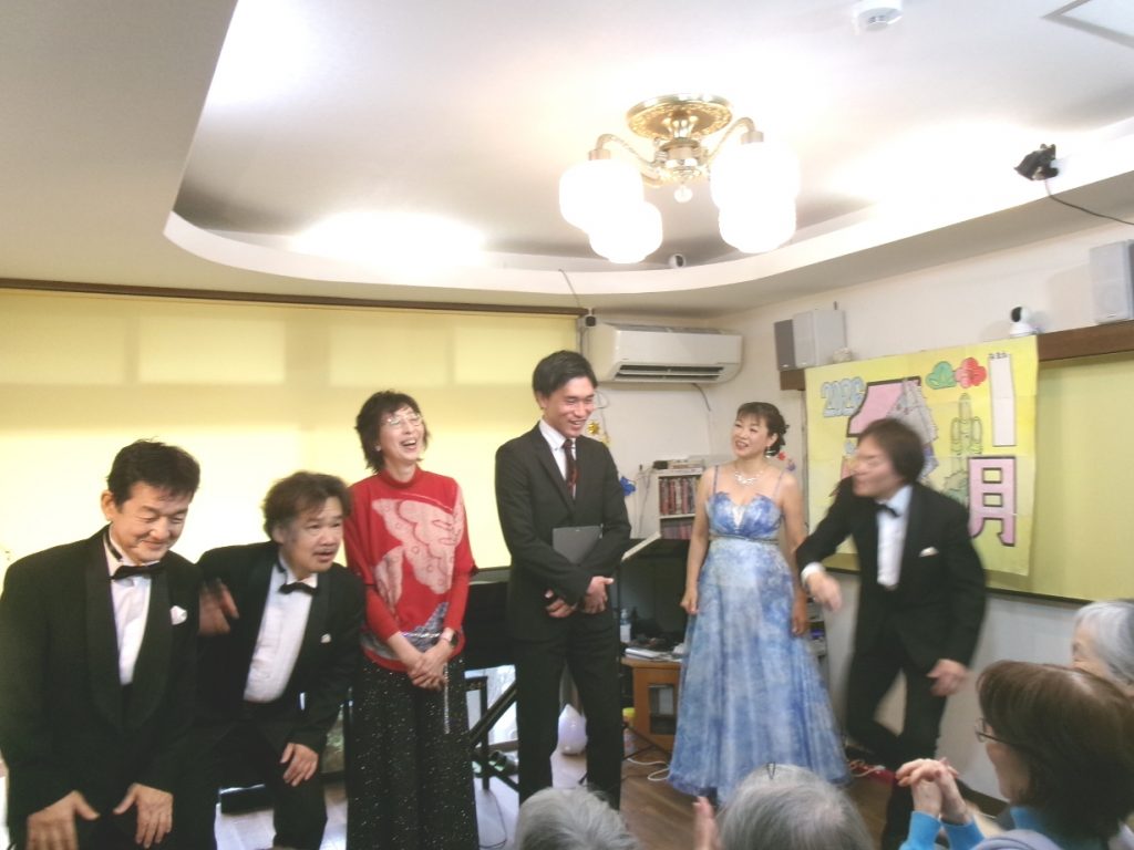 まずはオープニングのフニクリフニクラで元気よく登場。ご挨拶代わりのソロを一曲ずつ。友ちゃんの花占いはカッコよかったです。アンサンブルはいい日旅立ち。そして、ピアノ・ソロをそれぞれ一曲ずつ。下黒澤さんはドビュッシーの名曲「ゴリウォーグのケーク・ウォーク」を、三浦さんはチャイコフスキーの「四季」炉端にてを演奏。お二人とも雰囲気が出ていましたよ。みんなで歌おう「一月一日」で休憩です。