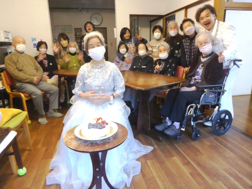 一昨年7月に入られたH様。もう1年半が経ちましたか。音楽、取り分けクラシックが大好きでしてね。合唱ではやわらかいソプラノの声で嬉しそうに歌っているのです。そんなH様にはシルバーのキラキラドレスを着ていただきました。メイクアップの時からもう満面の笑顔のH様。他の利用者様の大拍手の中で登場。あいさつもしっかりされていましたよ。