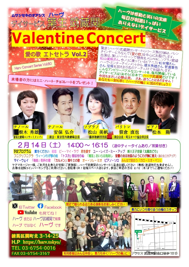 デイサービス 葉生(ハーヴ)武蔵関では、2/14(土)14時~ コンサート・シリーズ第60弾 Valentine Concert を開催します。