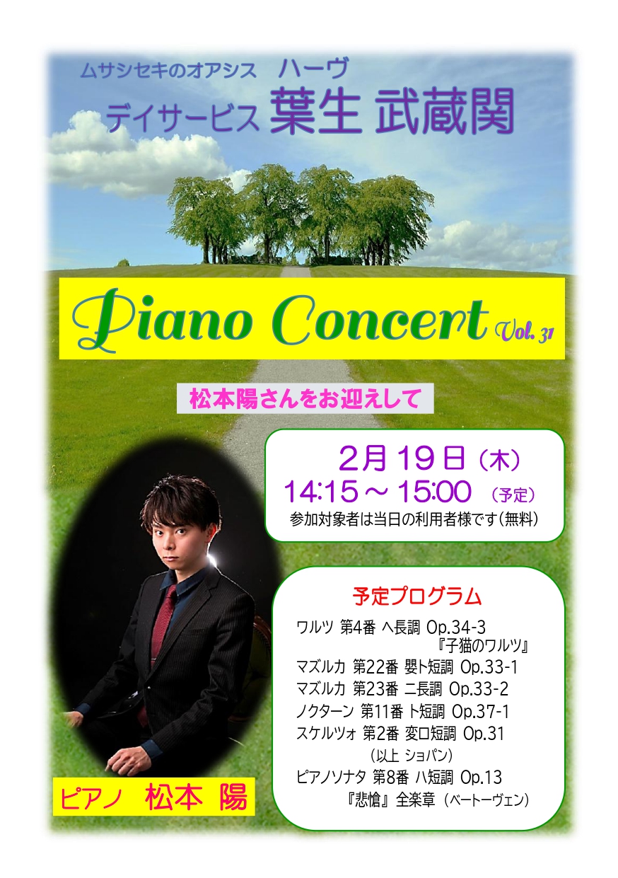ハーヴ武蔵関、ミニコンサート(ピアノ・コンサート/毎月開催)のお知らせです。