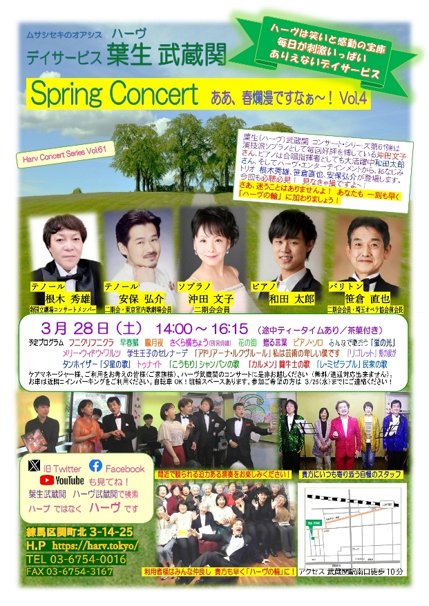 デイサービス『葉生(ハーヴ)武蔵関』では、3/28(土)14:00~ コンサート・シリーズ第61弾 Spring Concert (ああ、春爛漫ですなぁ~! Vol.4)を開催します。