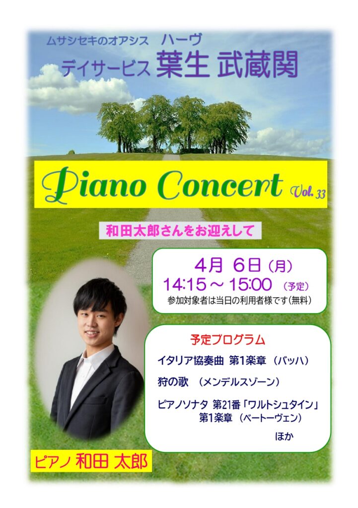 尚、このピアノ・コンサートは当日の利用者様が参加対象者ですが、ご覧になりたい方はどうぞ遠慮なくお越しください。一般の方もどうぞ。当日12時までにご一報ください(必ずご連絡ください/送迎対応は出来かねます/お車でお越しの方は近隣コインパーキングへ)。